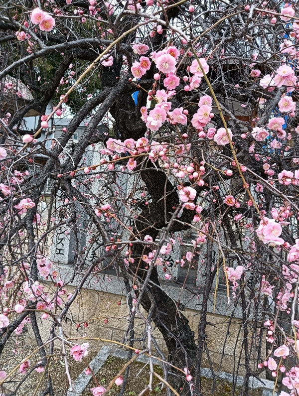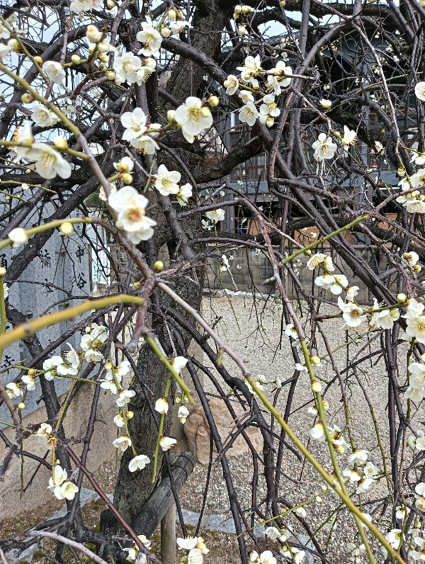 雪がちらつく日、氏神様の梅が精一杯咲いていて、春が近い